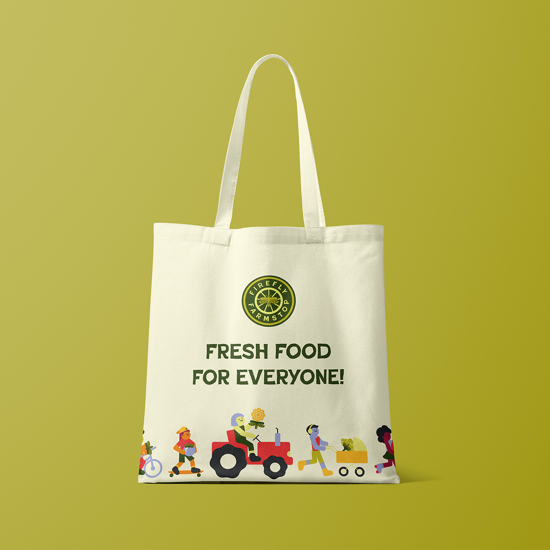 Additionally, a series of simple, character-based graphics was created to represent the people of Athens and Winterville. These figures highlight the diversity of the community and the many ways people can reach Firefly Farmstop, including someone on a bike, roller skates, a skateboard, a tractor, and a stroller. Together, these illustrations emphasize the family-friendly and community-centered nature of the space.